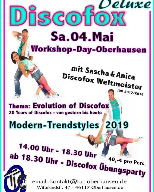 Die Weltmeister im Discofox Sascha und Anika Oltmann geben sich die Ehre und unterrichten in einem 4-Stunden Workshop "Discofox de Luxe" mit anschliesendem Discofox Übungsabend.